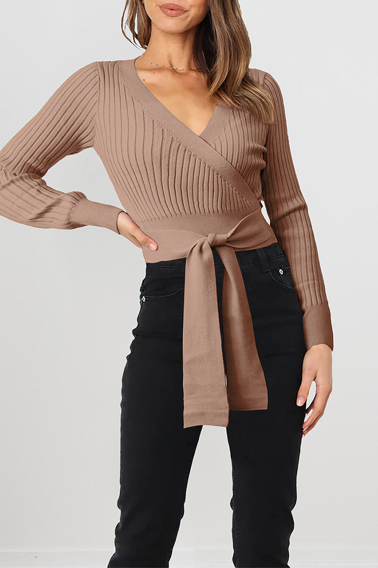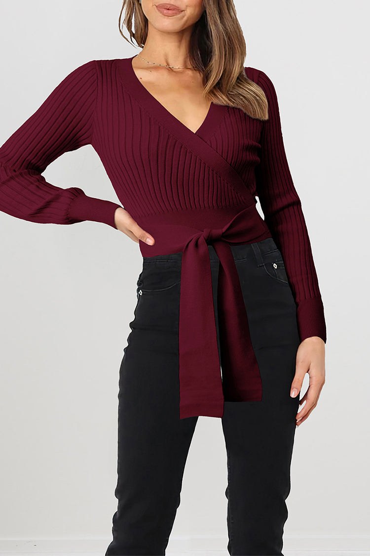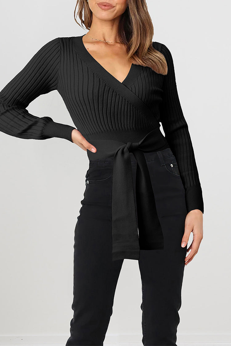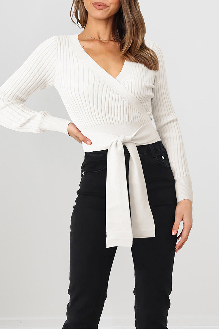 / High Waist Tie Front Slim Fit Ribbed Knit Pullover Sweater
