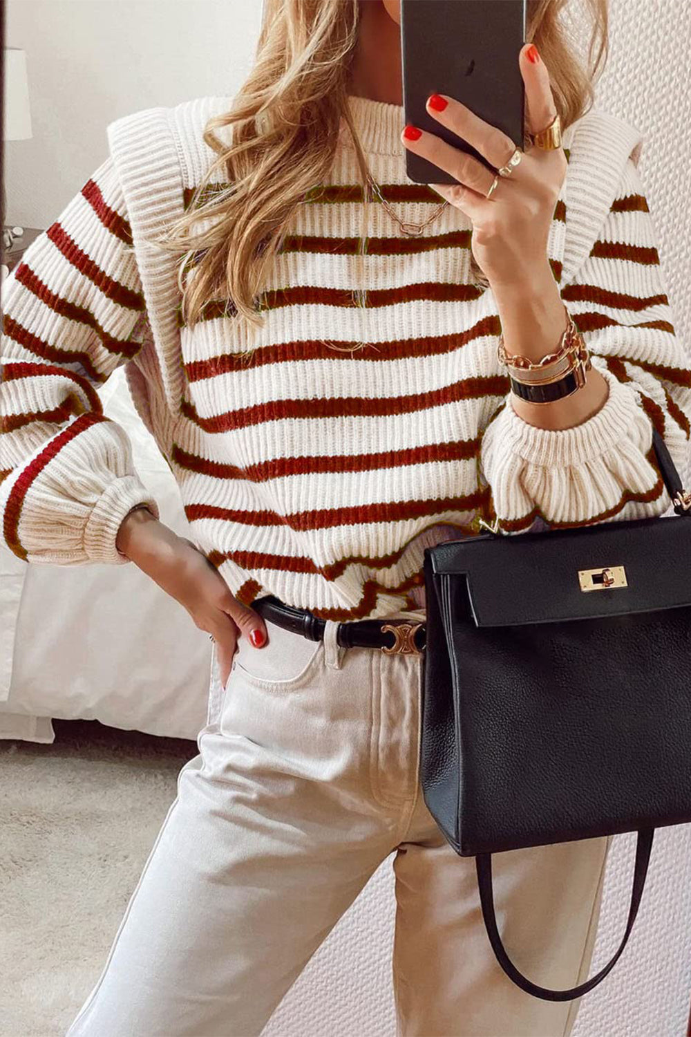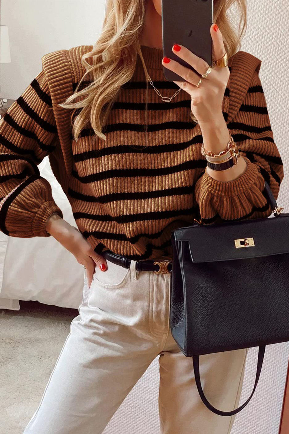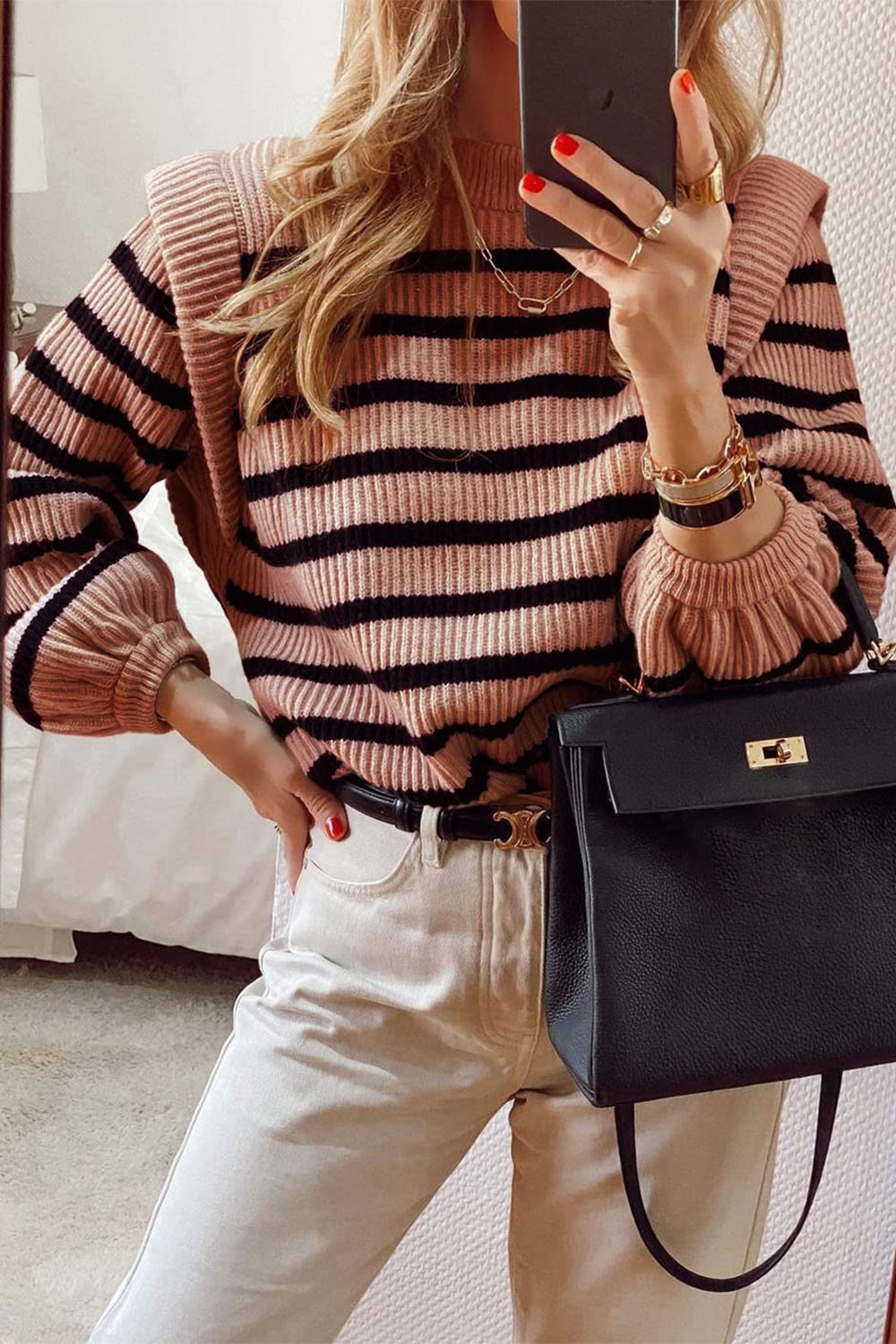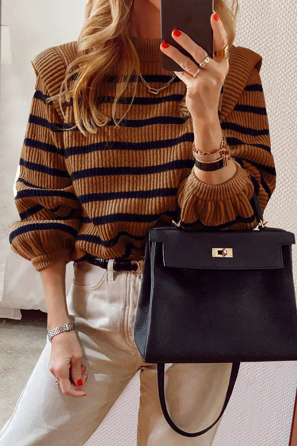 Long Lantern Sleeve Striped Ribbed Knit Pullover Top quantity