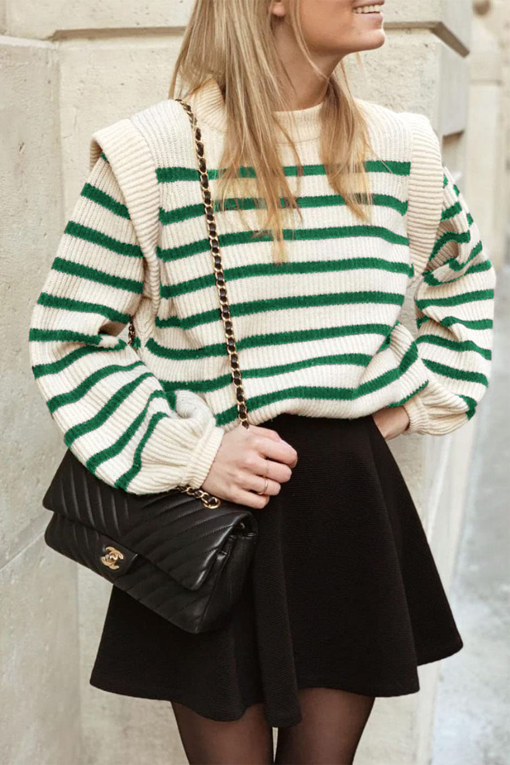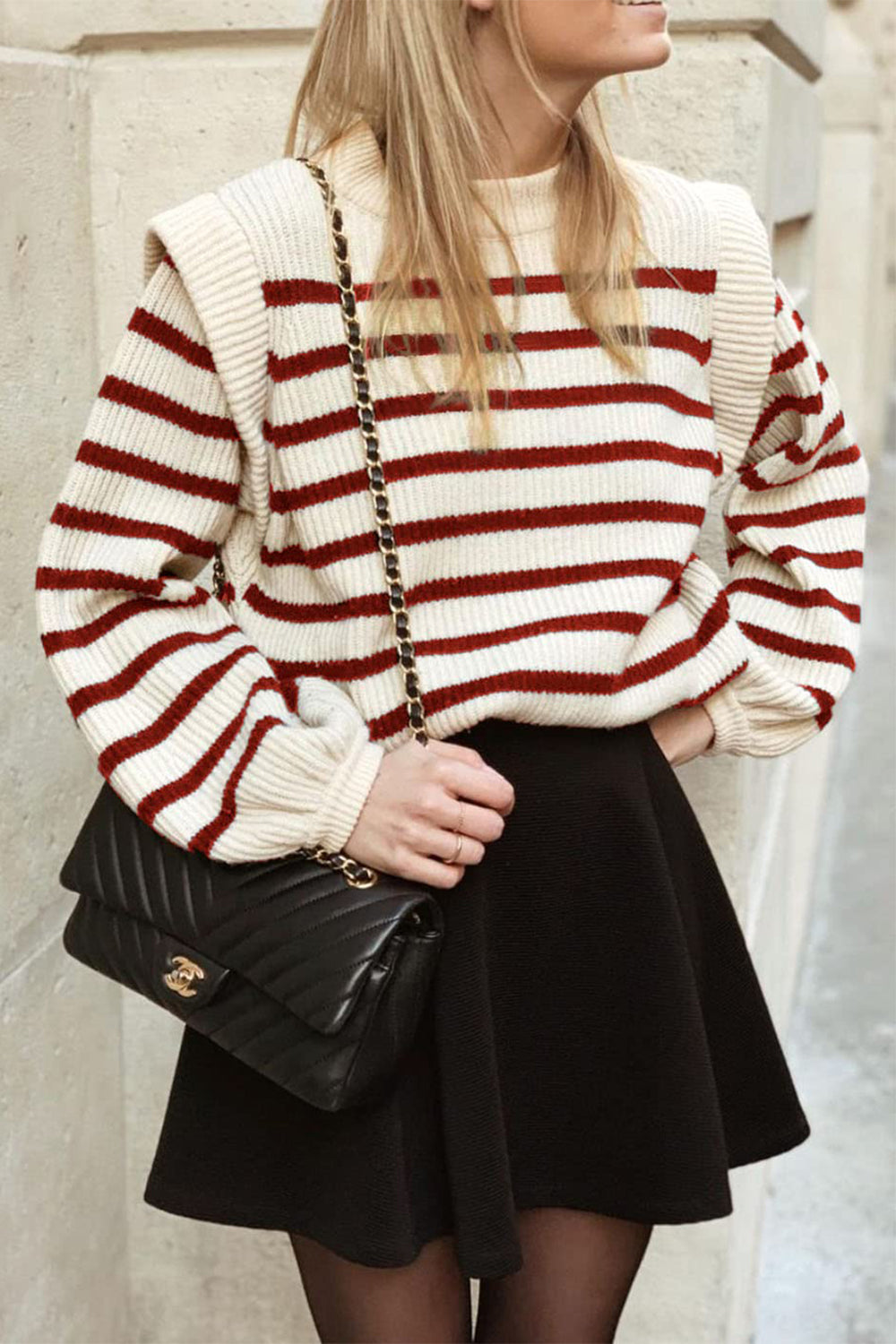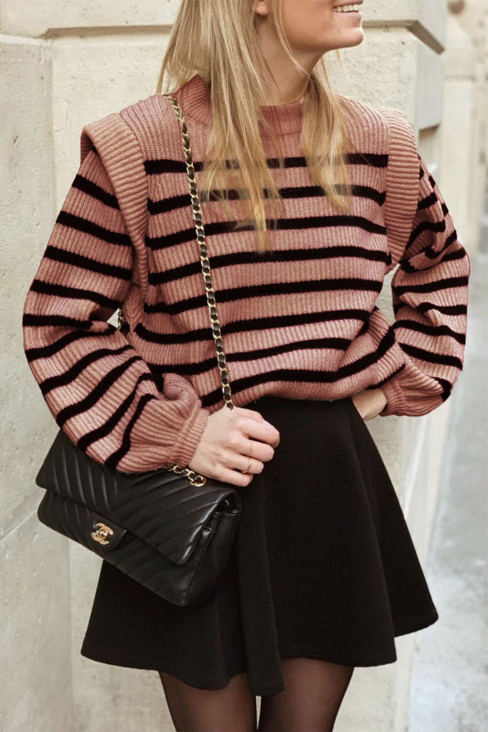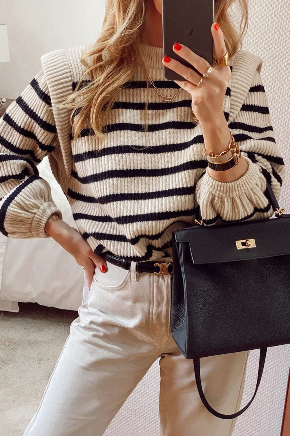 Long Lantern Sleeve Striped Ribbed Knit Pullover Top quantity
