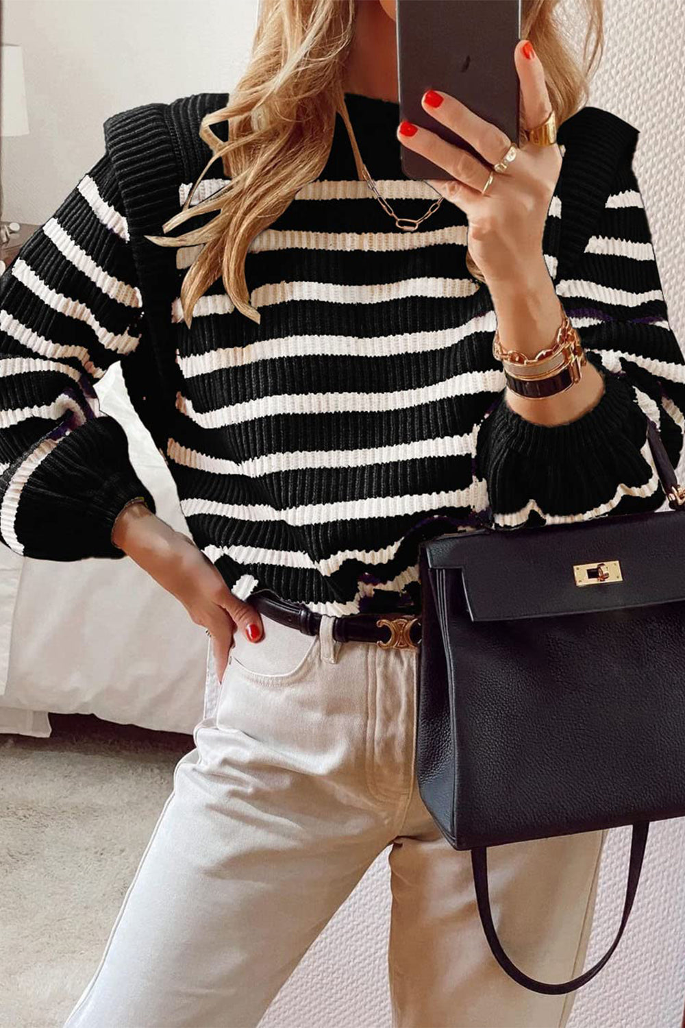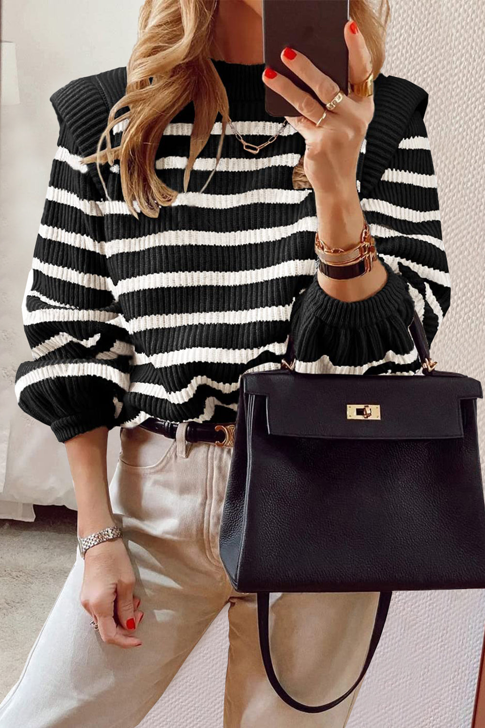 / Long Lantern Sleeve Striped Ribbed Knit Pullover Top