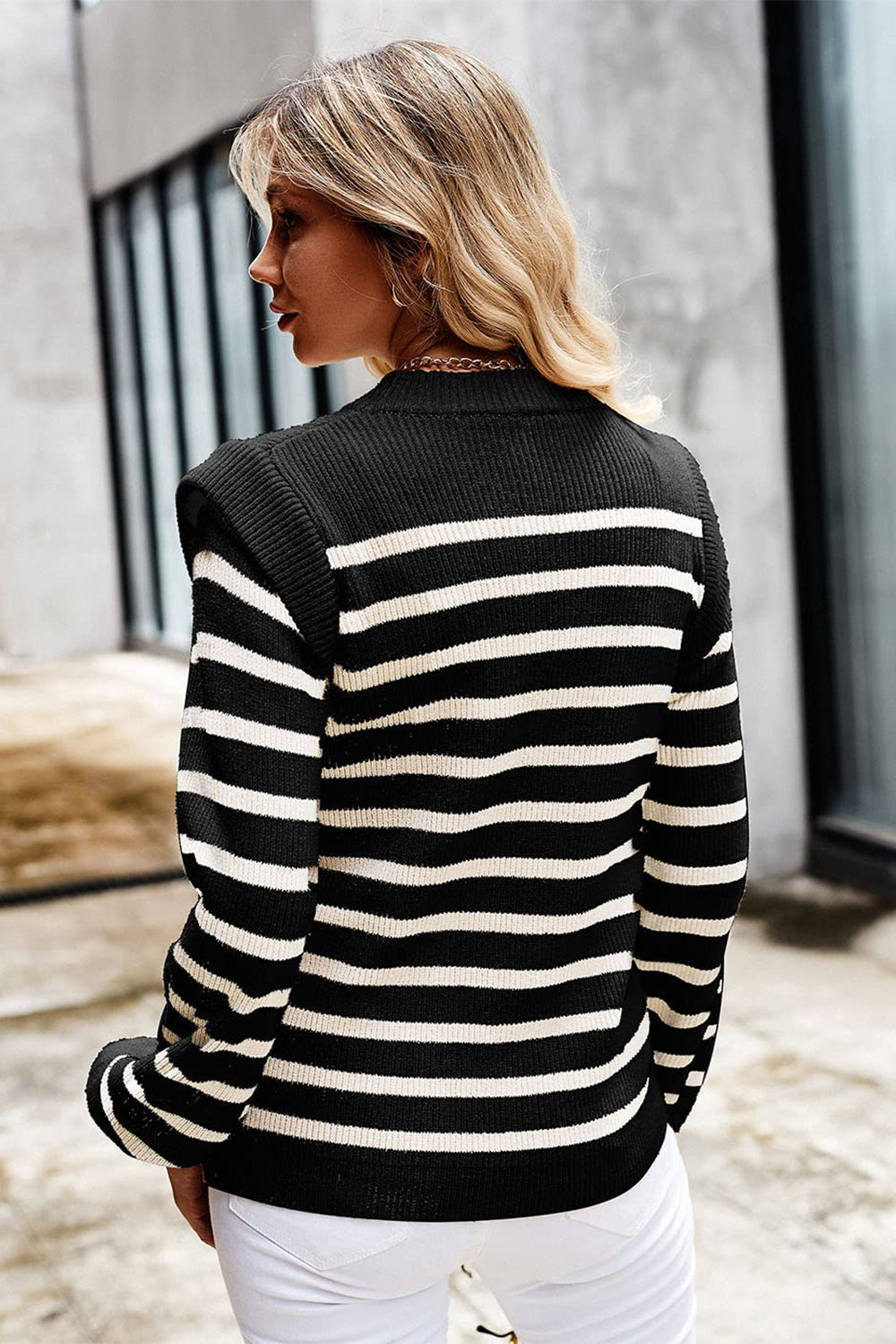 Long Lantern Sleeve Striped Ribbed Knit Pullover Top