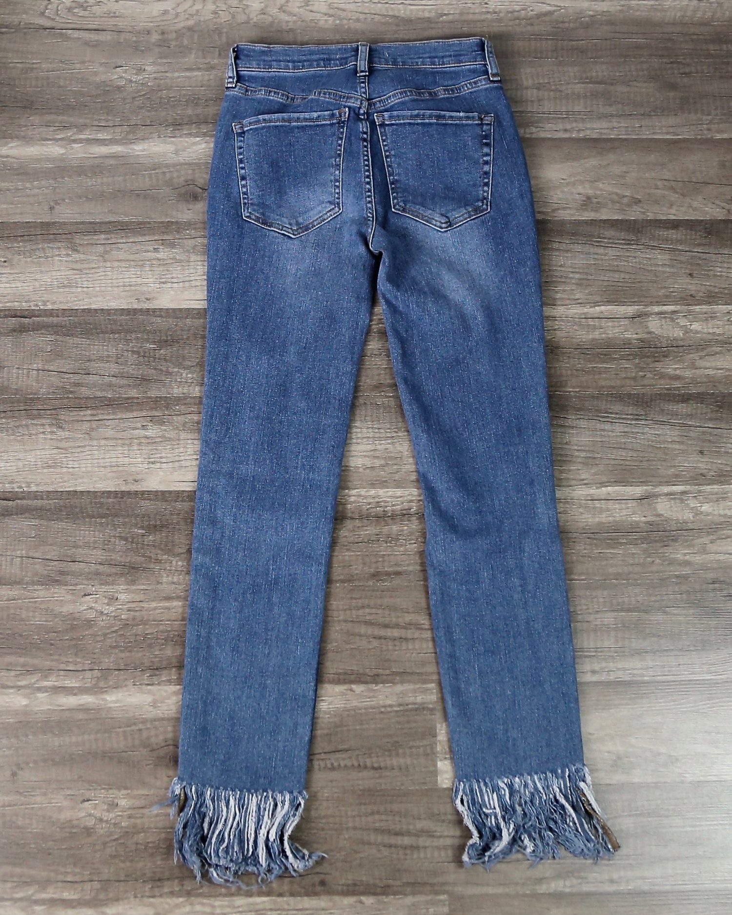 Super stretchy mid rise skinnies featuring busted out knees and raw edges. Five-pocket style with a button closure and zip fly.