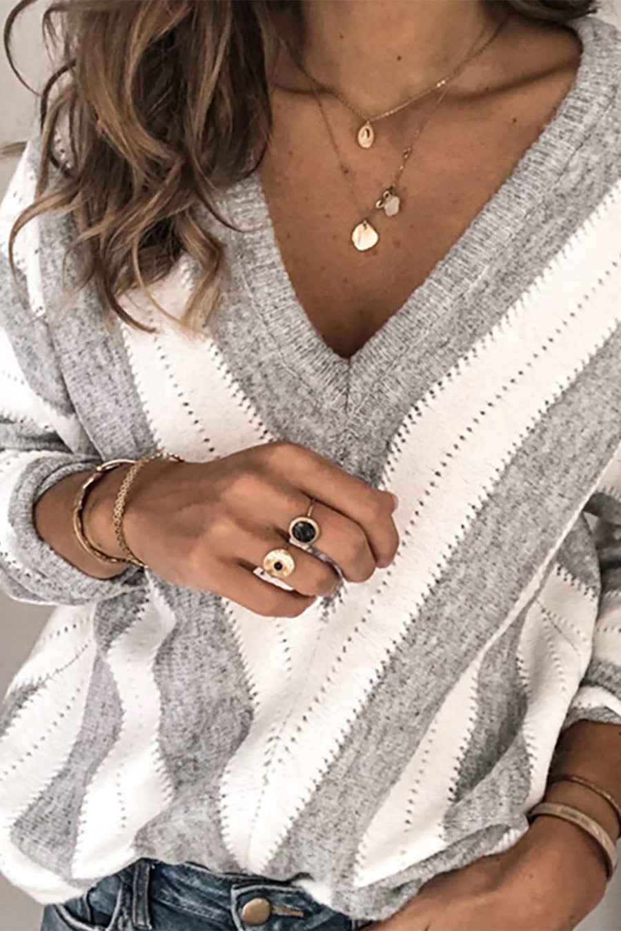 V Neck Stripe Color Block Loose Oversized Pullover Sweater