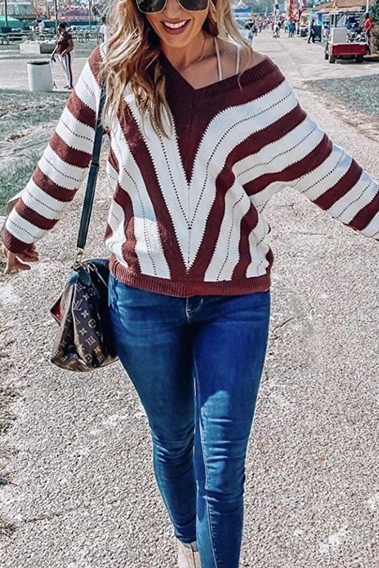 / V Neck Stripe Color Block Loose Oversized Pullover Sweater